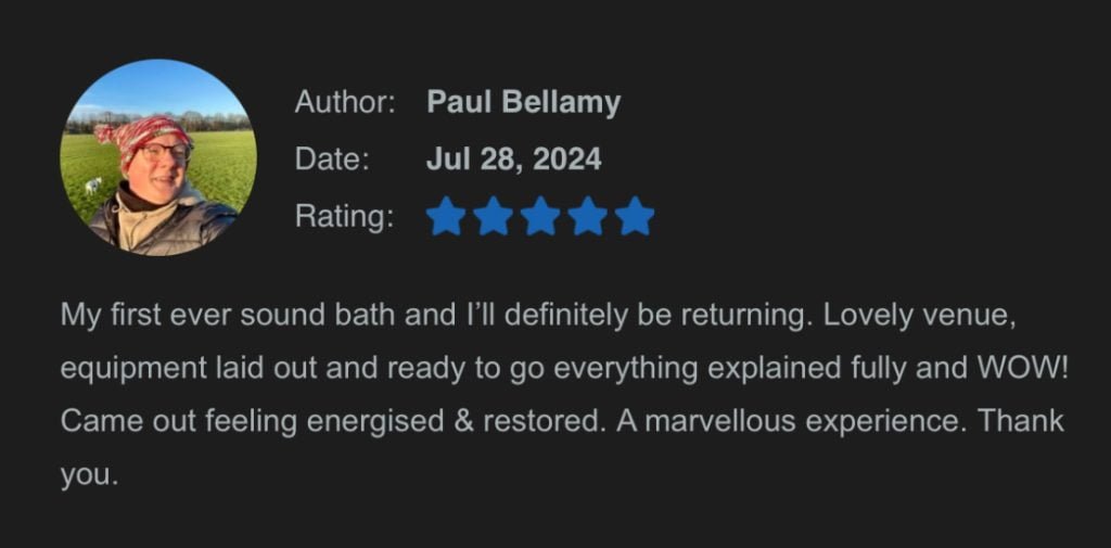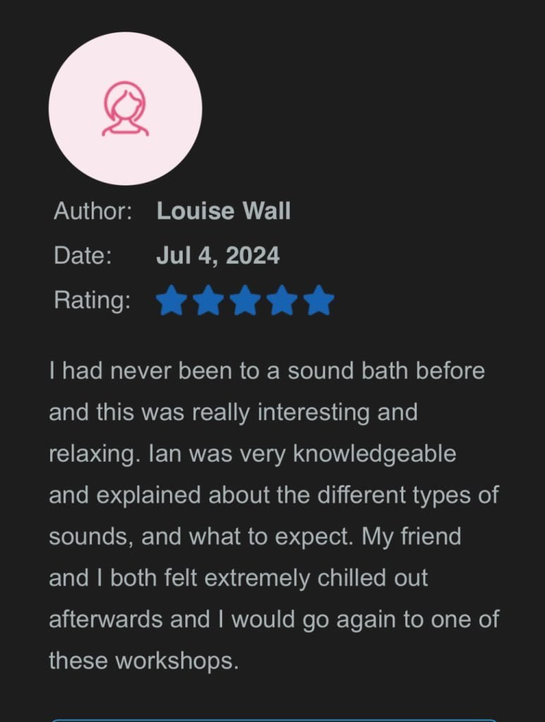 Ian plays gongs, crystal and himalayan bowls in a manner designed to induce deep relaxation and rest. The sounds ebb and flow that many have explained takes them on a peaceful journey into their unconscious mind. Where actual sleep is discouraged in Nidra, you may, if your body so chooses, fall asleep in the sound bath although the most benefit is typically obtained on that magical border between sleep and awake.